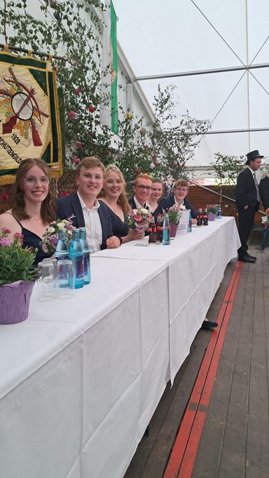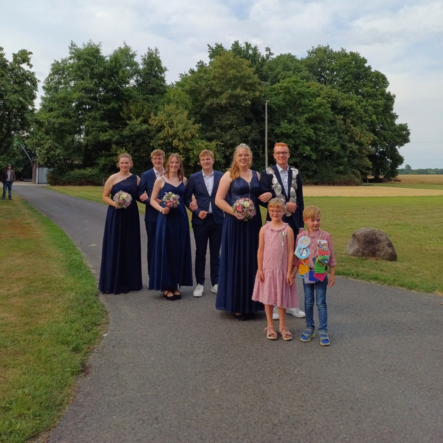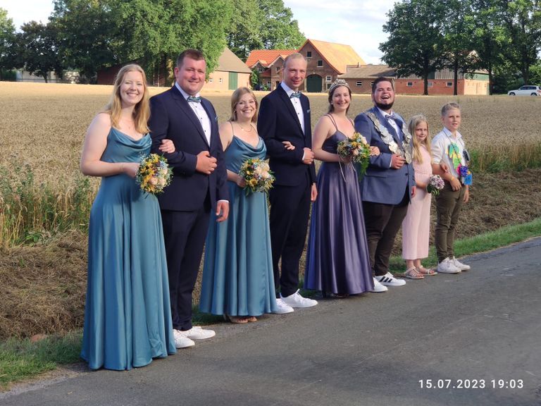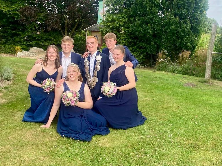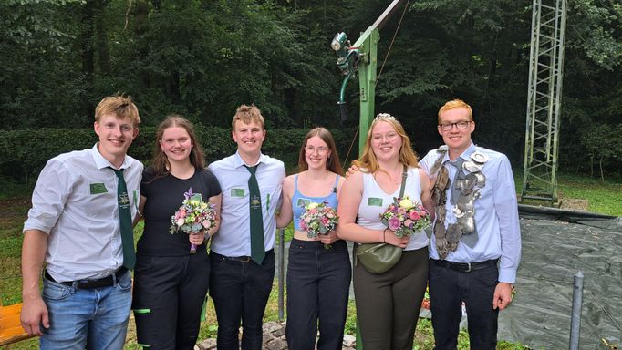 v.l.: Ehrendame Judith Menker, Ehrenherr Lukas Dinkler, Ehrendame Lena Robert, Ehrenherr Luis Mensing, Königin Juliana Höing und König Stefan Hörbelt